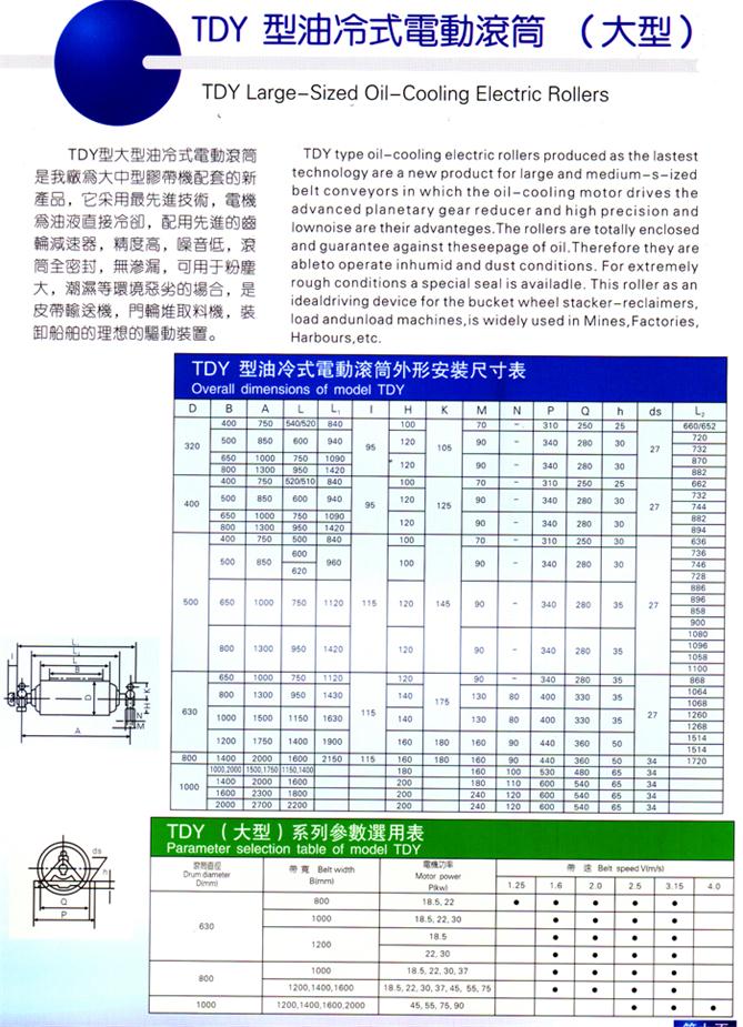 TDY型大型油冷式電動滾筒是我廠為大中型膠帶機配套的新產(chǎn)品,它采用最先進技術(shù),電機為油液直接冷卻,配用先進的齒輪減速器,精度高,噪音低,滾筒全密封,無滲漏,可用于粉塵大,潮濕等環(huán)境惡劣的場合,是皮帶輸送機、門輪堆取料機、裝卸船舶的理想的驅(qū)動裝置。