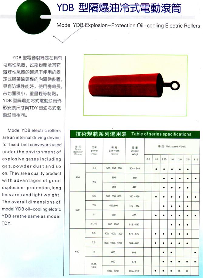 YDB型電動(dòng)滾筒是在具有可燃性所體,瓦斯粉塵及其它爆炸性氣體的環(huán)境下使用的固定式膠帶輸運(yùn)機(jī)的內(nèi)驅(qū)動(dòng)裝置,具有防爆性能好,使用壽命長,占地面積小,重量輕等特點(diǎn)。YDB型隔爆油冷式電動(dòng)滾筒外形安裝尺寸TDY型油冷式電動(dòng)滾筒相同。